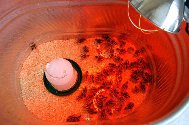 Within seconds of release, in Alex's garage, the chicks took to the food and water and all seemed okay..